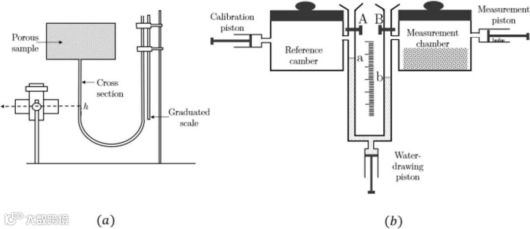 不同的孔隙率测量系统:(a)Beranek的系统(Beranek,2005)(b)空气体积比(Leclaire等人,2003年)