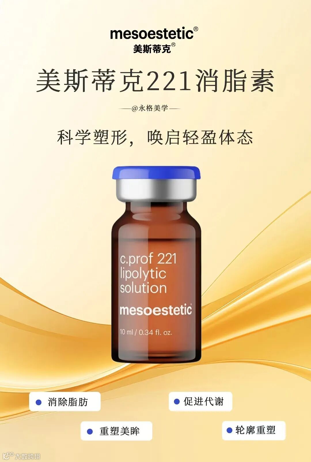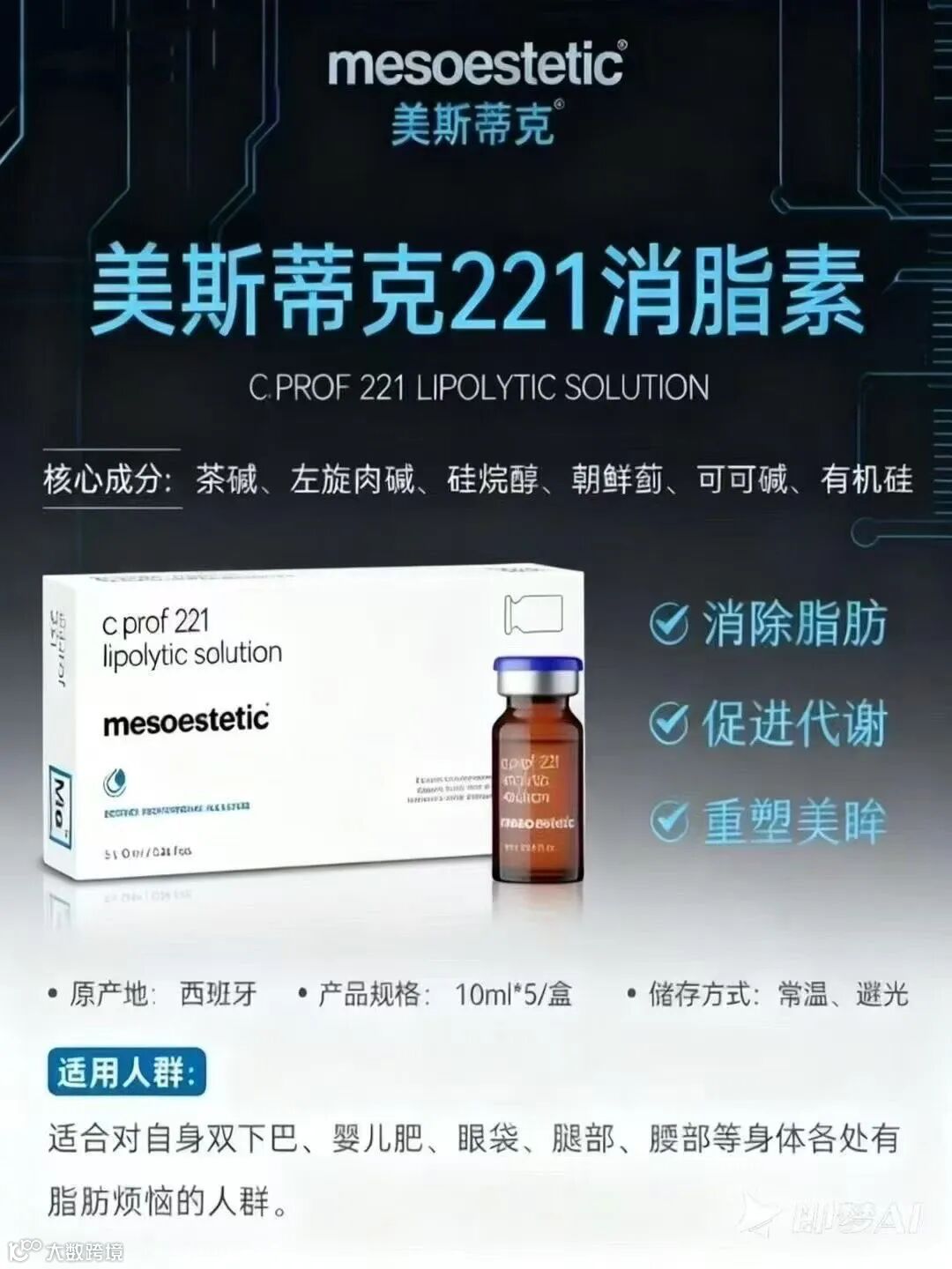 美斯蒂克所有产品均按照制药标准进行生产,全球利润的40%用于创新研发,以提升产品配方和更新生产设备。公司拥有三条符合欧洲药品生产质量管理规范(GMP)的生产线,涵盖医药级注射产品、医美专业产品及医学级护肤品。【产品名称】mesoestetic美斯蒂克221消脂针【规格】 10ml*5支/盒【产地】西班牙【主要成分】茶碱,左旋肉碱,洋蓟提取物,硅烷醇【适用范围】面部、身体通用。【适用人群】适合对自身双下巴、婴儿肥、眼袋、腿部、腰部等身体各处有脂肪烦恼的人群【储存条件】常温,避免阳光直射,不可冻藏。