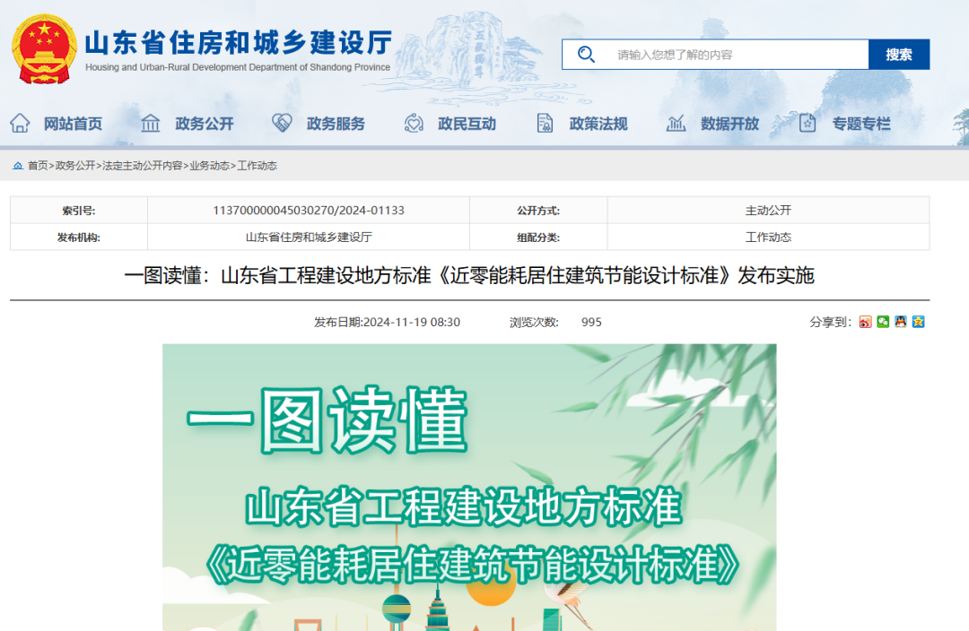 山东省住房和城乡建设厅、山东省市场监督管理局批准发布山东省工程建设标准《近零能耗居住建筑节能设计标准》DB37/T 5074-2024,并自2024年12月1日起施行。