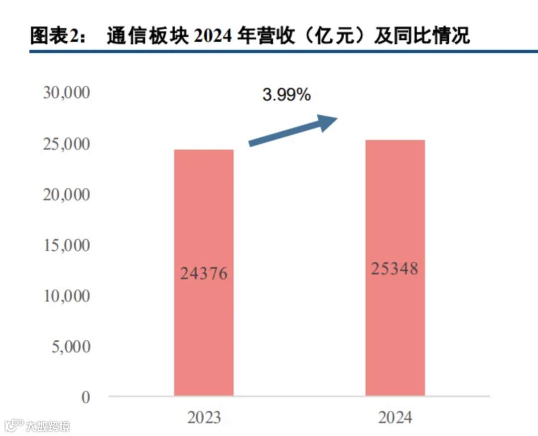 2024年,A股通信板块实现总营收25348.15亿元,同比增长3.99%;归母净利润达2070.31亿元,同比增长6.35%,利润增速高于收入增速[k]