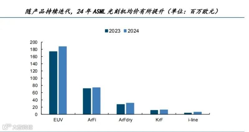 ASML凭借与台积电合作率先推出193nm浸没式光刻机,打破技术瓶颈,拉开与尼康、佳能的差距[k]。2013年推出EUV量产机型后进一步巩固领先地位[k]。2024年ASML共出货光刻机418台,其中EUV 44台,ArFi 129台,后者为销售额最高的品类[k]。当年EUV机型均价达1.88亿欧元,ArFi为0.74亿欧元,均呈上涨趋势[k]。