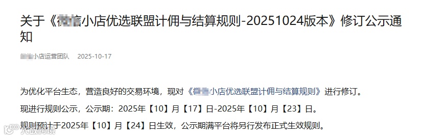 微信小店运营团队于2025年10月17日发布了《微信小店优选联盟计佣与结算规则-20251024版本》的修订公示。此次修订旨在优化平台生态,为带货者、商家和用户营造更公平、透明的交易环境。新规则预计于2025年10月24日正式生效,公示期为2025年10月17日至10月23日。以下是本次修订的核心内容,带货者和合作伙伴需重点关注!