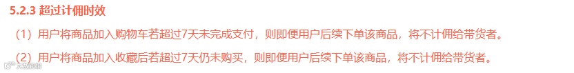 用户将商品加入购物车或收藏后,超过7天未支付,后续下单不计佣。
