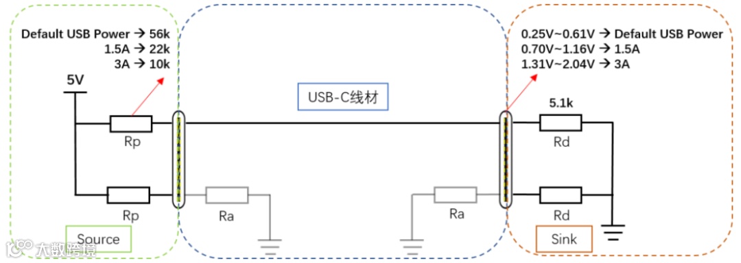 当两个设备连接完成后,Sink通过检测Rp和Rd的分压值vRd获取Source的供电能力。如下为Rp值、vRd电压范围与Source供电能力的对应关系。