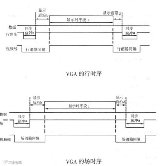 VESA中定义行时序和场时序都需要同步脉冲(Sync a)、显示后沿(Back porch b)、显示时序段(Display interval c)和显示前沿(Front porch d)四部分。VGA工业标准显示模式要求:行同步,场同步都为负极性,即同步脉冲要求是负脉冲。