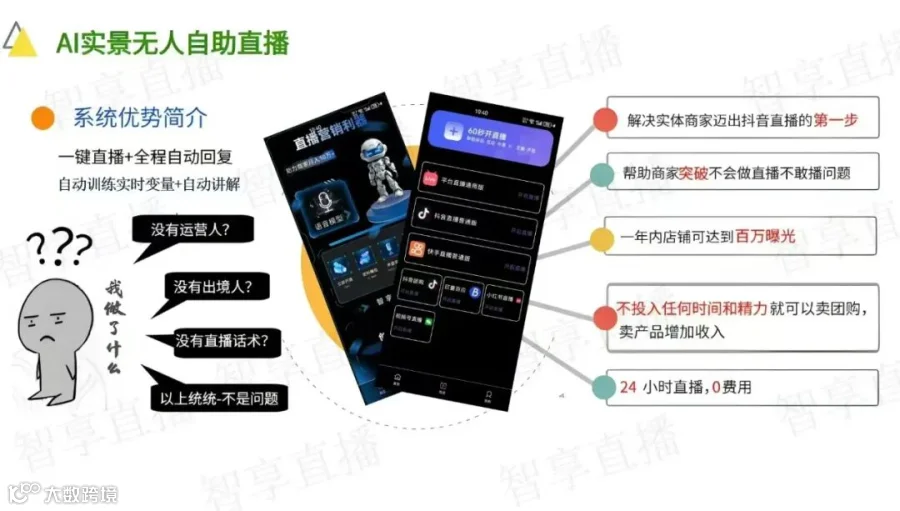 智享AI直播三代的核心价值在于将实景/录播内容与AI智能互动完美结合,打造出一个低成本、高效率的“永动机”式直播间。