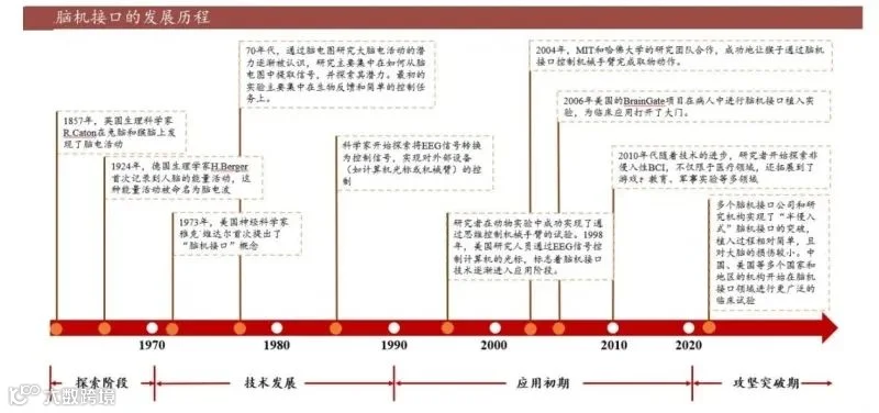 脑机接口发展历程可分为四个阶段:1960–1970年为探索期,重点研究脑电信号提取;1970–1990年进入技术发展期,早期聚焦侵入式方法,后期转向非侵入式;1990–2020年为应用初期,计算能力与信号处理技术推动解码精度提升;2020年至今进入攻坚突破期,半侵入式技术成为主流发展方向[1]。