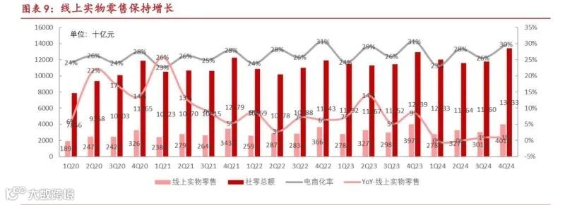 2022-2023年线上实物零售增速7-8%,渗透率超27%[k]。2025年618首周期,淘天GMV份额达48.4%,同比提升0.8个百分点,稳居第一[k]。拼多多、抖音电商、京东、快手电商份额分别为11.5%、18.1%、18.2%、3.7%[k]。各平台增速普遍放缓,行业进入精细化运营阶段[k]。QuestMobile数据显示,抖音2024年1-10月MAU同比增长仅8%[k]。各大平台相继推出商家减负措施,强化供给端运营[k]。