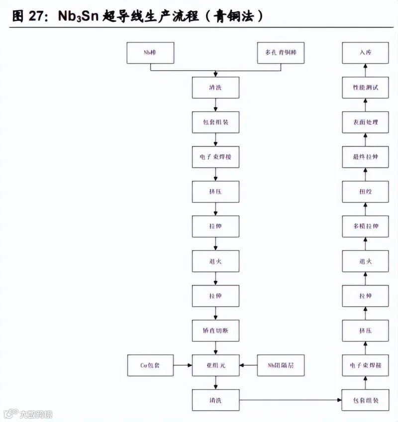 Nb3Sn为A15型晶体结构的金属间化合物,超导转变温度约18K,上临界磁场可达20T[k]。其主要制备方法包括内锡法和青铜法:内锡法临界电流密度高(4.2K、12T下最高达3000A/mm²),但芯丝耦合严重导致交流损耗大;青铜法临界电流密度适中,芯丝不耦合,交流损耗较低[k]。国际上主要生产商包括德国Bruker公司(内锡法主导)、日本JASTEC和古河电气(主推青铜法),以及中国西部超导公司[k]。