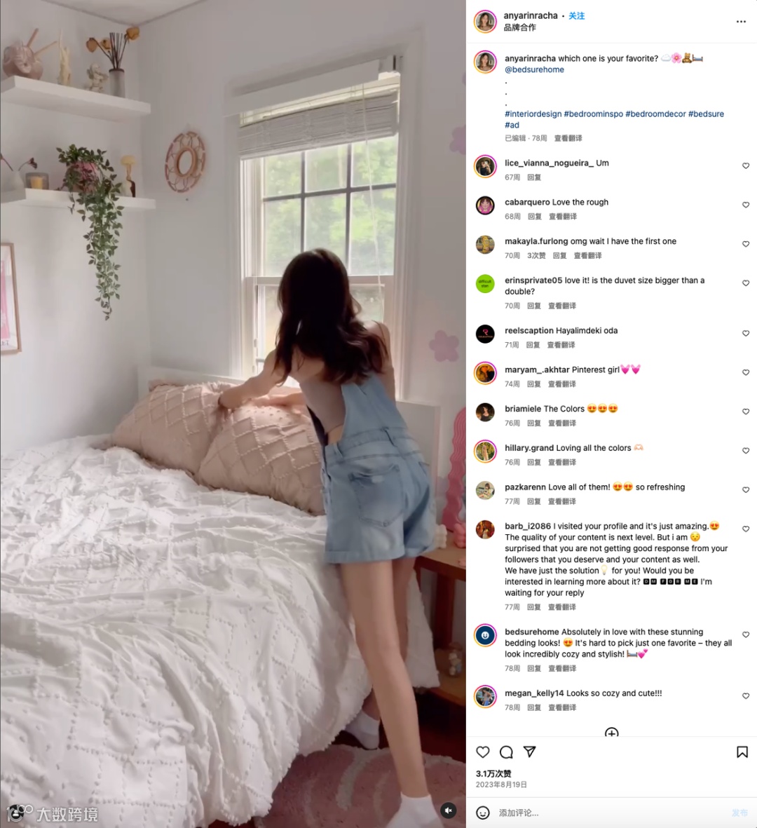 而这也是Bedsure之所以在Instagram上大量合作女性Lifestyle类、家居生活类红人的原因。在很多时候,消费者购买的并不只是产品本身,而是品位。