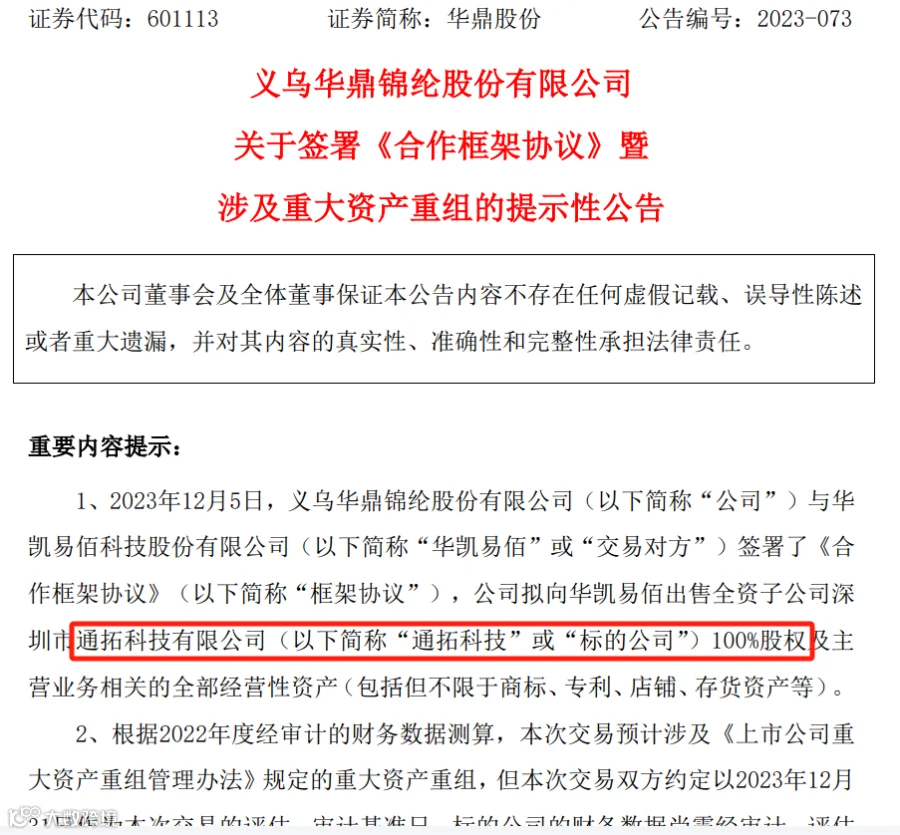12月5日消息,华凯易佰科技股份有限公司公告称,公司今日与义乌华鼎锦纶股份有限公司签署了《合作框架协议》,公司拟以现金方式收购华鼎股份持有的深圳市通拓科技有限公司100%股权及主营业务相关的全部经营性资产(包括但不限于商标、专利、店铺、存货资产等)