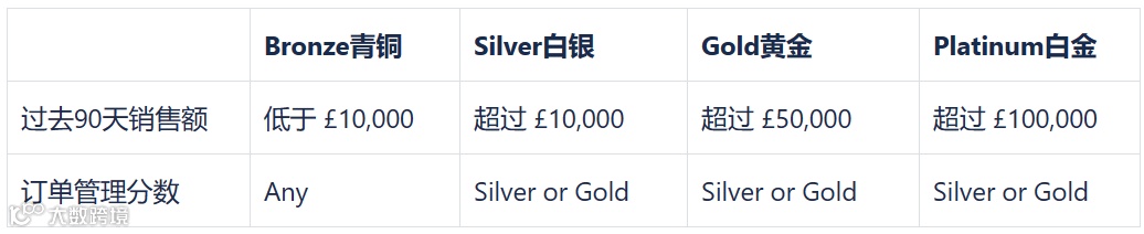 晔子:在卖家品类、规模或是SKU数量上我们没有特别的倾斜,但会根据销售额、订单表现(发货时效、取消率、退货率等)、NPS(Net Promoter Score,净推荐值)客户满意度评分等卖家运营指标,将卖家分为青铜、白银、黄金、白金等不同账户级别(如下图),并提供个性化服务,以及重点支持优秀账户。比如对于行业内知名大卖和关键账户,我们有专属的账户经理,提供人工服务支持。