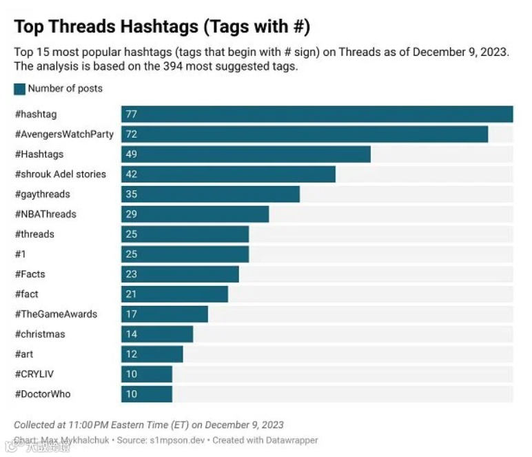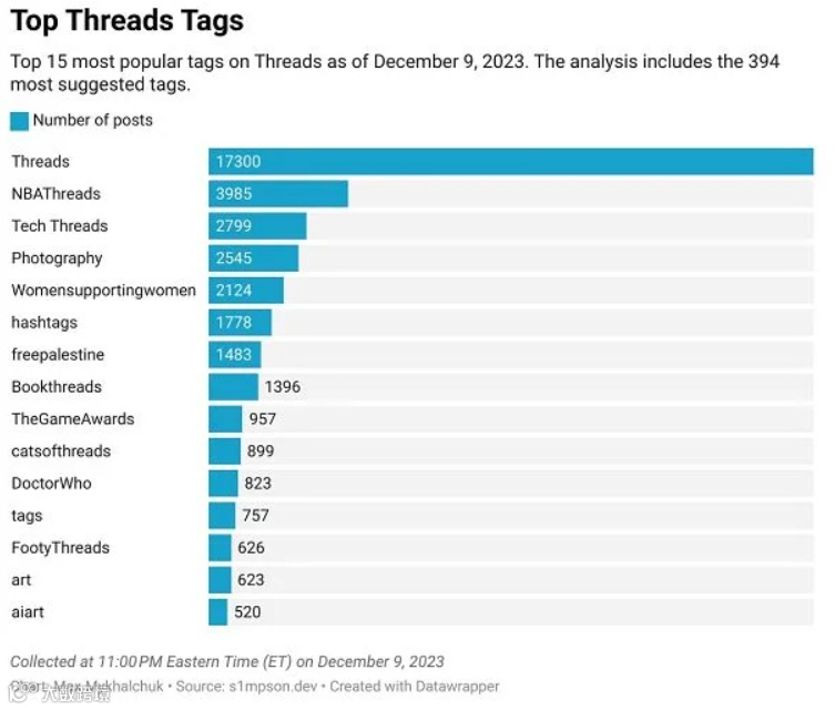 虽然这不是一门精确的科学,并且仅与包含主题标签的 Threads 帖子相关,但 Web 开发人员Max Mykhalchuk根据应用程序中列出的使用数量,汇总了迄今为止最热门的 Threads 标签的概述。