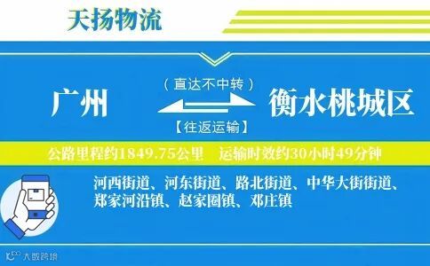 13826279566点击拨打电话 天扬物流广州至衡水桃城区专线1849.75公里30小时49分钟极速直达,全程高速覆盖衡水桃城区全域及河西街道、河东街道、路北街道、中华大街街道、郑家河沿镇、赵家圈镇、邓庄镇,主城区免费上门提货。提供整车/零担/冷链/大件运输,配备AI监控+三维固定+温控技术,支持运输险及智能动态计费,企业可定制月结方案。