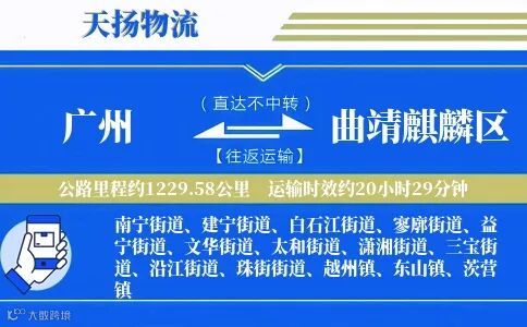 13826279566点击拨打电话 天扬物流广州至曲靖麒麟区专线1229.58公里20小时29分钟极速直达,全程高速覆盖曲靖麒麟区全域及南宁街道、建宁街道、白石江街道、寥廓街道、益宁街道、文华街道、太和街道、潇湘街道、三宝街道、沿江街道、珠街街道、越州镇、东山镇、茨营镇,主城区免费上门提货。提供整车/零担/冷链/大件运输,配备AI监控+三维固定+温控技术,支持运输险及智能动态计费,企业可定制月结方案。