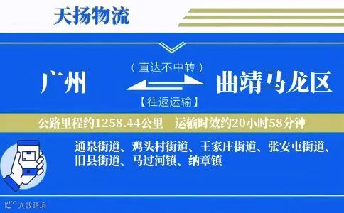 13826279566点击拨打电话 天扬物流广州至曲靖马龙区专线1258.44公里20小时58分钟极速直达,全程高速覆盖曲靖马龙区全域及通泉街道、鸡头村街道、王家庄街道、张安屯街道、旧县街道、马过河镇、纳章镇,主城区免费上门提货。提供整车/零担/冷链/大件运输,配备AI监控+三维固定+温控技术,支持运输险及智能动态计费,企业可定制月结方案。