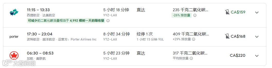 多伦多-洛杉矶直飞票价约159加元,后续转机回国全程亦可低于1000加元,性价比突出。