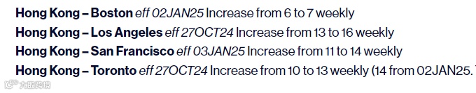 香港-洛杉矶:2024年10月27日起,每周从13班增至16班