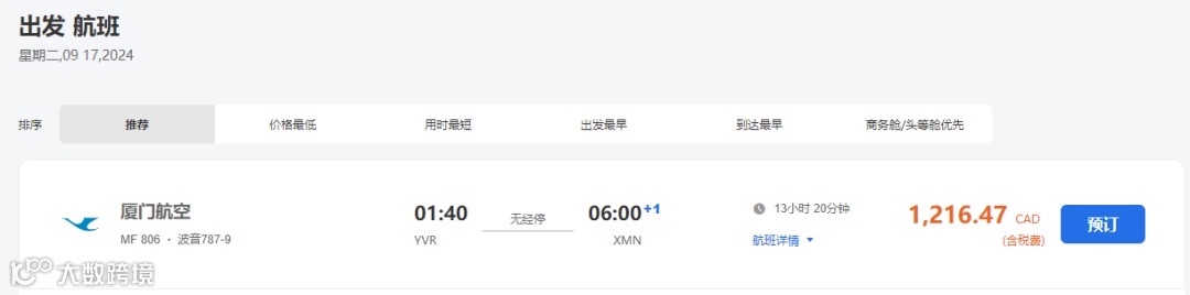 厦门航空也提供温哥华直飞航线:温哥华-厦门单程含税1216加元,温哥华-福州999.37加元,温哥华-泉州1011.37加元。