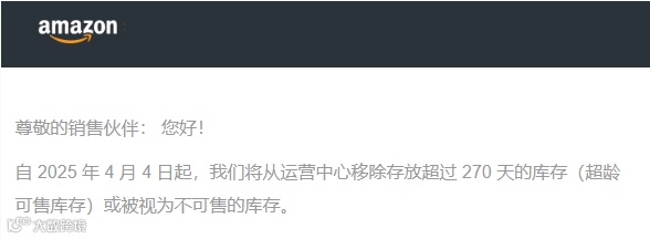 亚马逊在邮件中表示:自2025年4月4日起,我们将会清除运营中心内存放超过270天的库存(超龄可售库存)或被认定为不可售的库存。