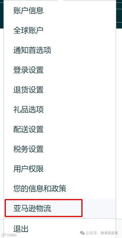 2.前往卖家平台设置,然后在下拉菜单中选择亚马逊物流。