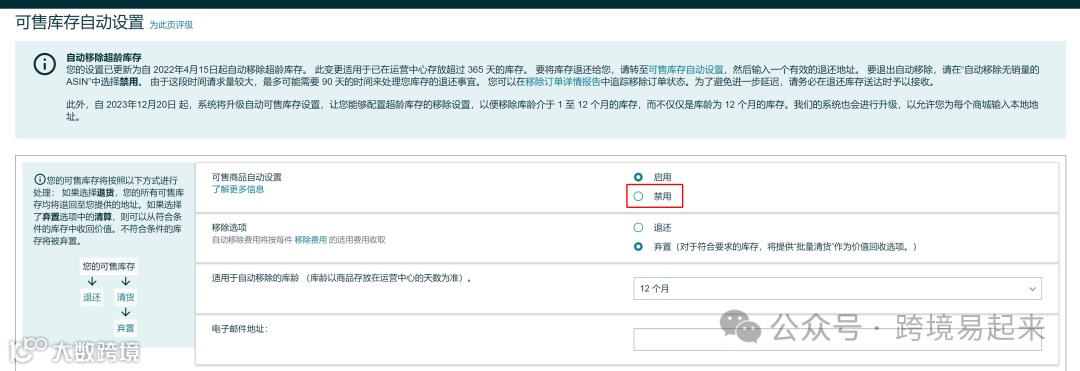 有些卖家提出了案例请求,客服的答复是:“请在设置菜单中选择亚马逊物流,找到自动可售库存设置,然后选择禁用。这样系统就不会自动移除库存,只会每月收取超龄库存的附加费用。”