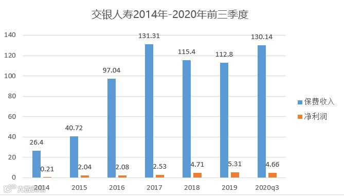 作为典型的银行系险企,交银人寿依托交通银行网点优势,保费曾实现大幅跃升。2011年股东变更后三个月内,保费同比增速达1100.66%[k]。2014年至2017年,年度保费收入从26.4亿元增长至131.31亿元。但因过度依赖银保渠道,2018年起主动压缩万能险和中短存续期产品,导致2018年、2019年保费分别降至115.4亿元、112.8亿元[k]。