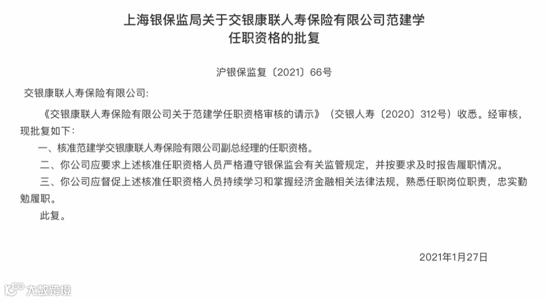 历经一年八个月的监管审批,银保监会最终核准股权变更。变更后,交通银行持股62.5%,日本MS&AD保险集团持股37.5%,形成银行与保险巨头联合控股的新格局[k]。2021年1月18日,公司正式获准更名为交银人寿[k]。