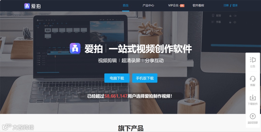 “爱拍”集录屏与直播一体,拥有丰富的录屏功能,不过大部分需要VIP; 具备视频编辑、视频剪辑、视频合并、视频加音乐等视频编辑功能。支持电脑下载、手机版下载。