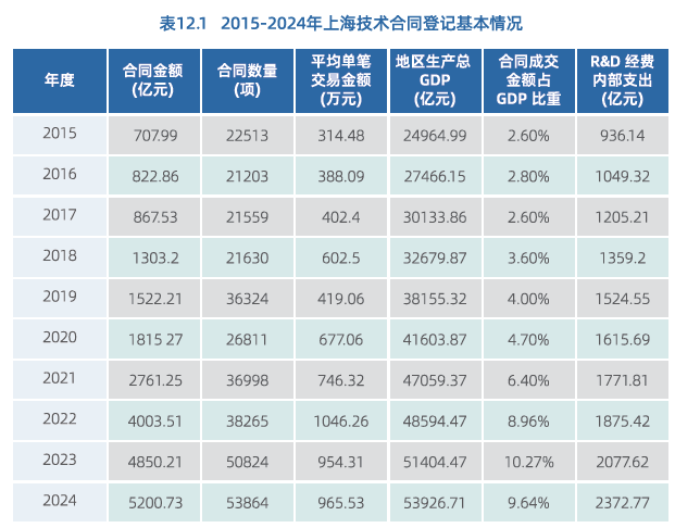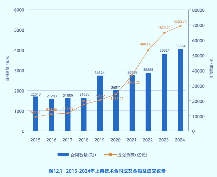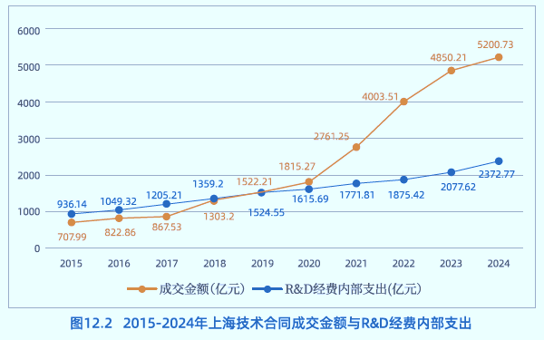 2015至2024年,上海技术合同成交金额逐年递增,2020年后呈加速增长趋势,R&D经费内部支出稳步增长(图12.2)。