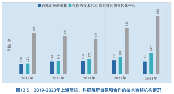 2023年上海高校、科研院所自建的技术转移机构数量为146家,合作的市场化转移机构数量为247家高校、科研院所与企业共建的研发机构、技术转移机构、服务平台数量共688家。