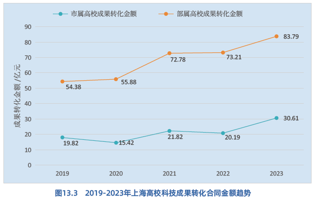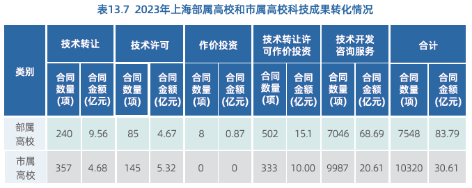 2023年上海部属高校通过技术转让、技术许可、作价投资、技术开发、技术咨询、技术服务6种方式转化科技成果的合同金额继续保持增长趋势,达83.79亿元,同比增加14.45%。