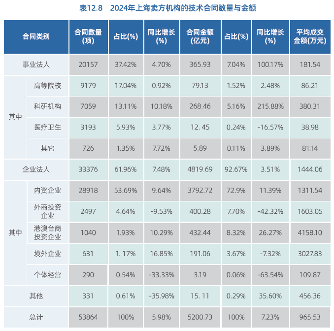 2024年企业输出技术合同成交金额为4819.69亿元,同比增长3.51%,占全市技术合同成交总金额的比重达92.67%。从技术合同平均成交金额上看,港澳台商投资企业为4158.1万元,排名第一;企业法人的技术合同平均成交金额为1444.06万元,高于事业法人的181.54万元。