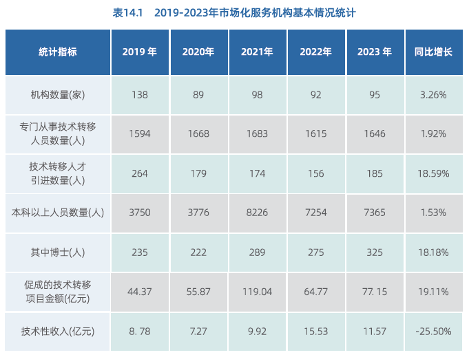 2023年上海市场化服务机构数量为95家,同比增长3.26%。专门从事技术转移人员数量为1646人,同比增长1.92%。市场化服务机构促成的技术转移项目金额为77.15亿元,同比增长19.11%。