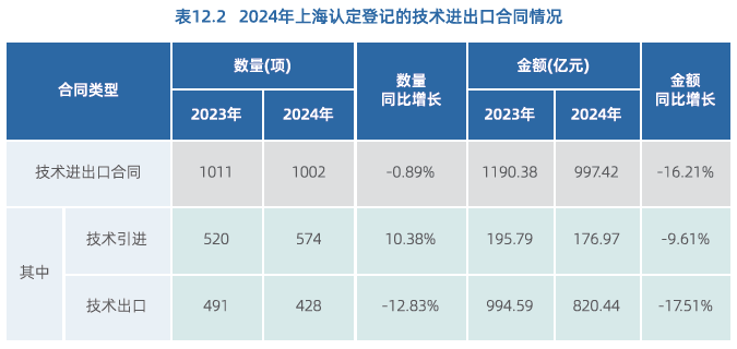 2024年上海认定登记的技术进出口合同数量和金额与去年同期相比均有所下降,其中合同金额为997.42亿元,同比下降16.21%。