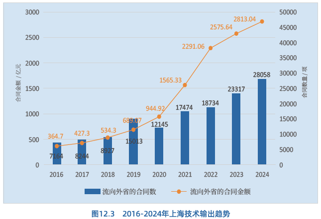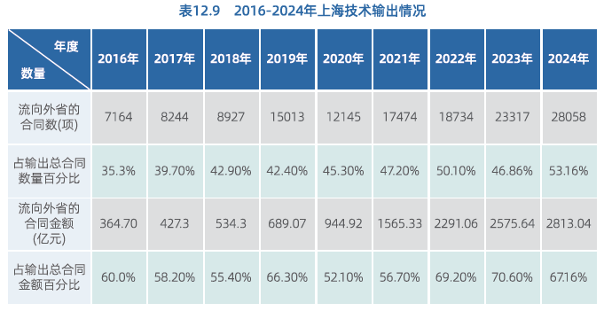 技术输出整体情况。2024年,上海向外省市(含港澳台)输出技术的合同金额为2813.04亿元,占技术输出合同总金额的67.16%,同比增长9.22%。