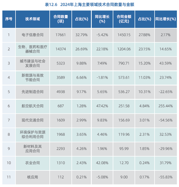 2024年,电子信息、生物医药和医疗器械、城市建设与社会发展合同金额位居前三,占合同总金额的66%以上。