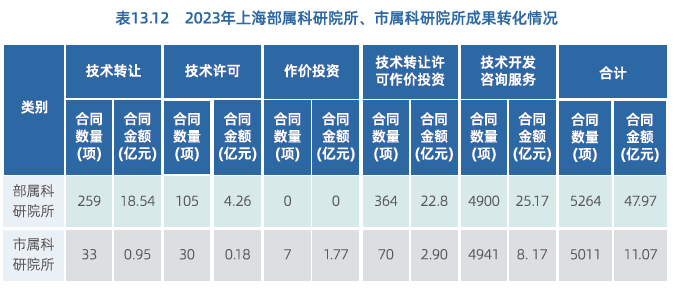 2023年上海部属科研院所通过技术转让、技术许可、作价投资、技术开发、技术咨询、技术服务6种方式转化科技成果的合同金额为47.97亿元,同比增长19.45%。