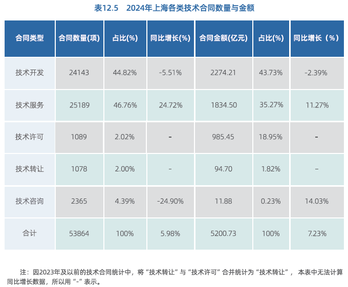 2024年经本市认定登记的五类技术合同中,技术开发合同金额为2274.21亿元,在技术合同总金额中占比43.73%。