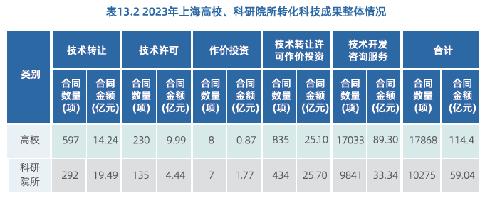 上海高校以技术开发、技术咨询、技术服务方式转化科技成果的合同金额为89.3亿元,高于科研院所的33.34亿元。