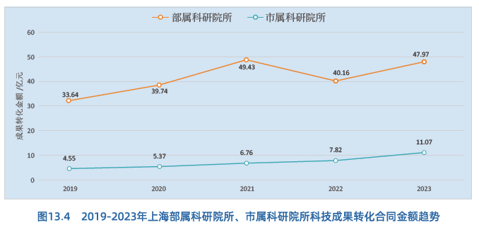 上海部属科研院所通过技术转让、技术许可、作价投资方式转化科技成果的合同金额为22.8亿元,高于市属科研院所的2.9亿元。