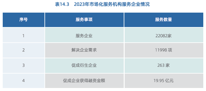 市场化服务机构共服务企业22082家,解决企业需求11998项,促成行生企业创办263家,促成企业获得融资金额19.95亿元。