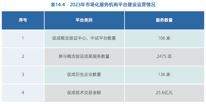 市场化服务机构共促成概念验证中心、中试平台数量106家,依托平台参与概念验证成果服务数量2475项,促成衍生企业136家,促成技术交易金额25.6亿元。