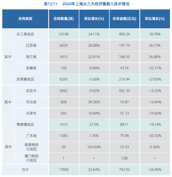 从三大经济圈输入技术情况。2024年上海从三大经济圈输入技术的合同数量为17896项,同比增长23.64%;技术合同金额为742.92亿元,同比降低24.4%。从苏浙皖地区输入技术的合同金额最多,为409.24亿元,同比增长18.78%。