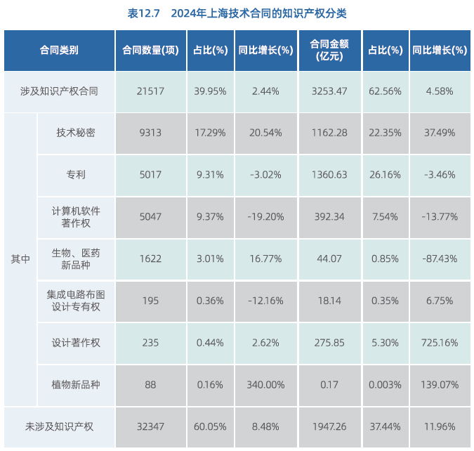 2024年,涉及知识产权的技术合同成交额达3253.47亿元,占全市技术合同成交额的62.56%。