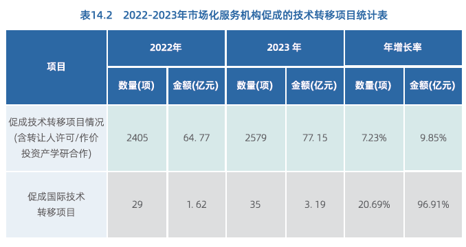 2023年,上海市场化服务机构促成的技术转移项目数量与金额均有增长,其中促成技术转移项目总金额为77.15亿元,同比增长9.85%。促成国际技术转移项目35项,金额3.19亿元。