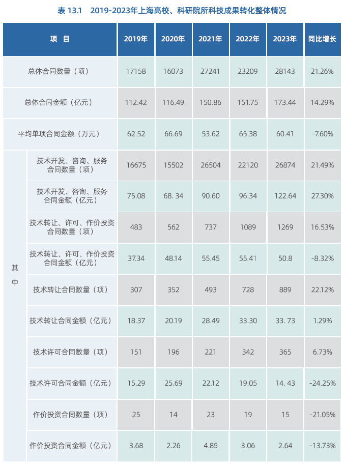 2023年,上海高校以技术转让、技术许可、作价投资、技术开发、技术咨询、技术服务6种方式转化科技成果的合同金额为114.4亿元,同比增长22.48%。