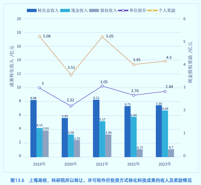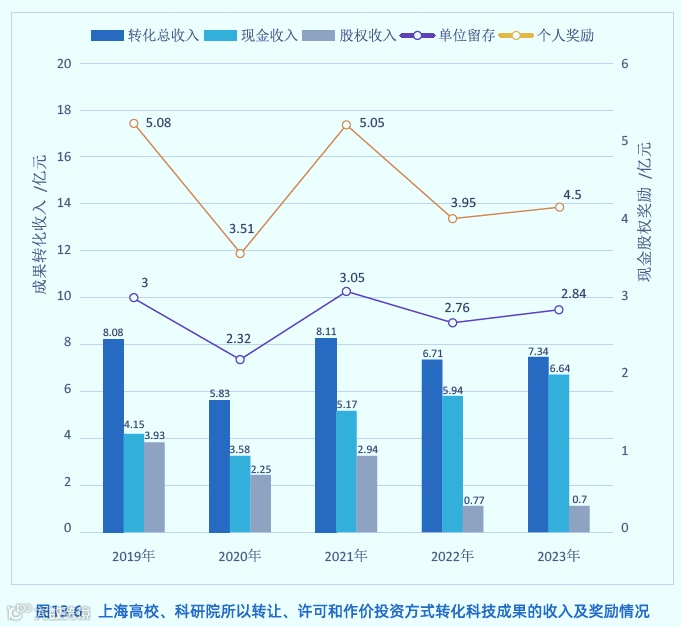 2023年上海高校、科研院所以技术转让、技术许可和作价投资方式转化科技成果获得收入总额为7.34亿元,同比增加9.4%。