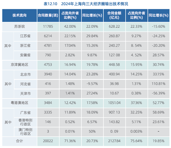 向三大经济圈输出技术情况。苏浙皖、京津冀和粤港澳地区是上海输出技术的主要目的地,三个区域的技术合同金额占上海流向外省技术合同金额的75.64%,其中向粤港澳地区输出技术的合同金额最高,为1050.04亿元,同比增长52.77%。