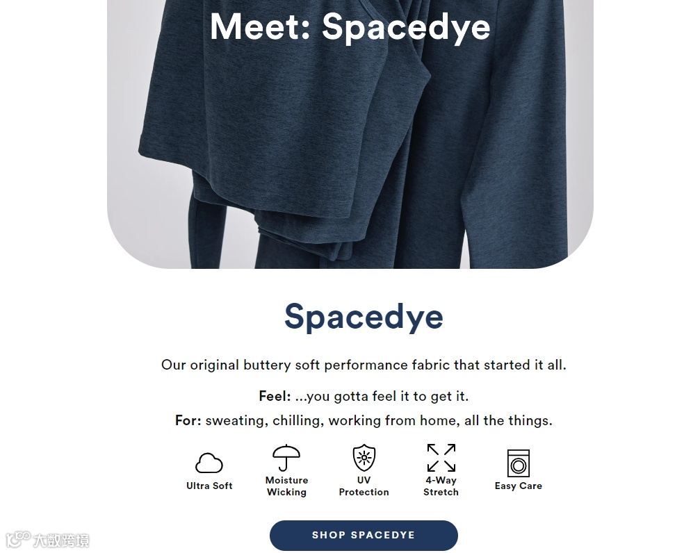 面料介绍:由于瑜伽服是贴身衣物,因此消费者在购买瑜伽服时,也会非常注重其面料。Beyond Yoga在网站中,添加了其原创面料的解释说明,这是能够打消部分消费者的疑虑,从而对转化产生正面影响的。